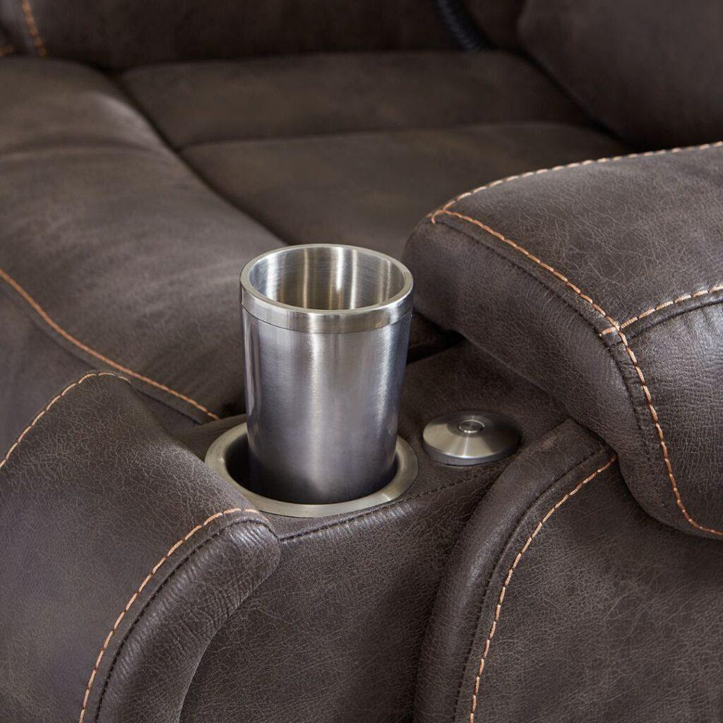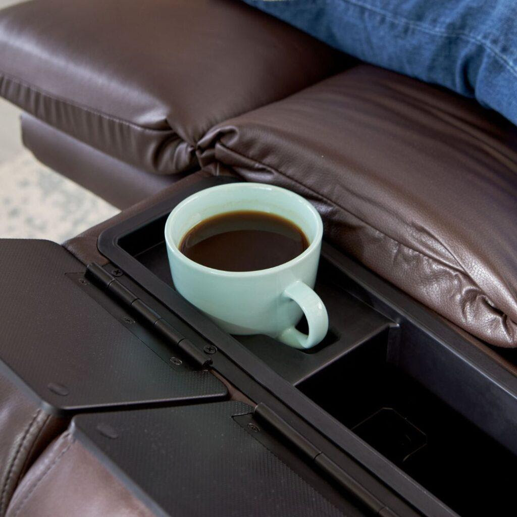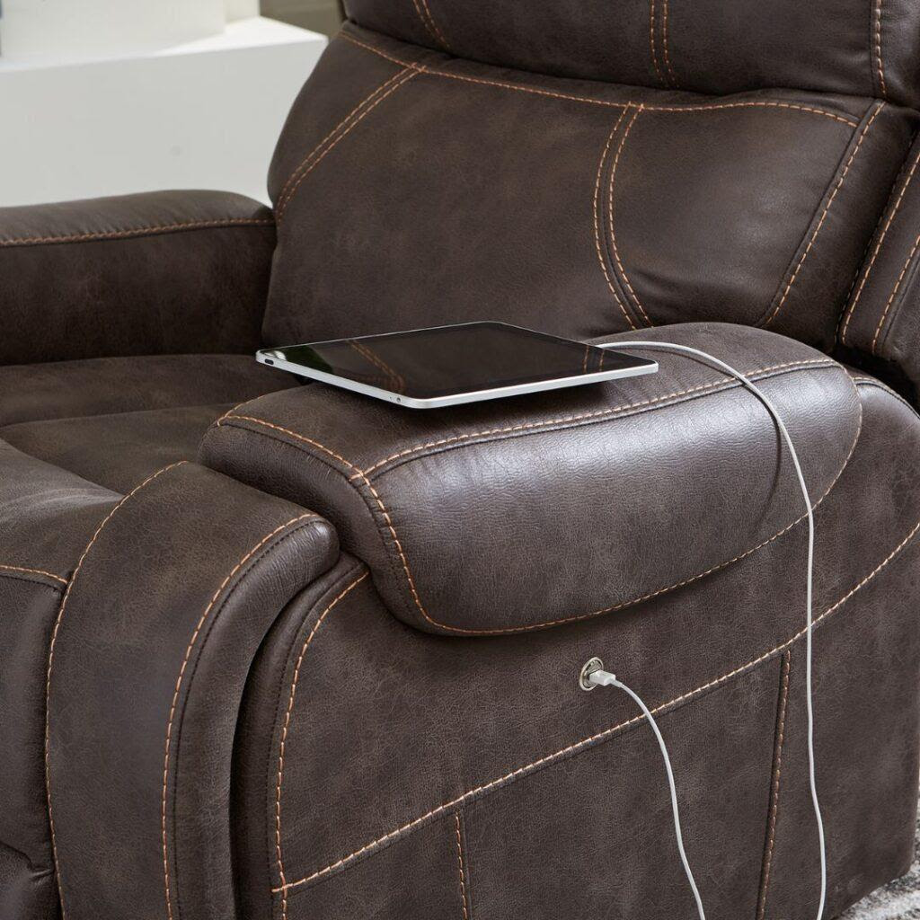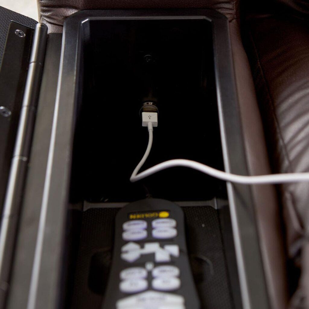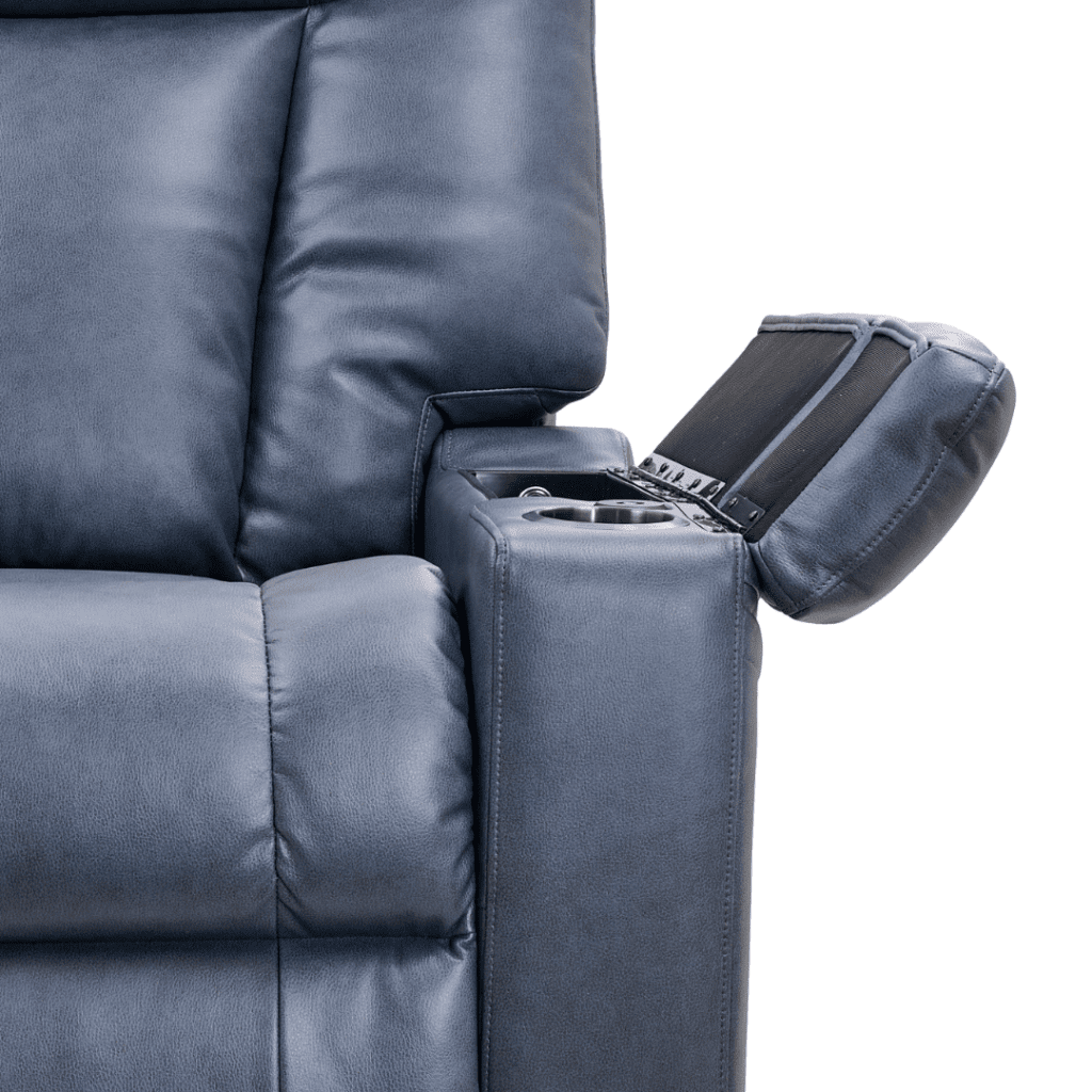 The right arm compartments house a hand control dock, wireless phone charger, and power port compatible with the included LED reading light and butler tray. On the left, you’ll find a build-in drink holder, USB port, and extra storage space.