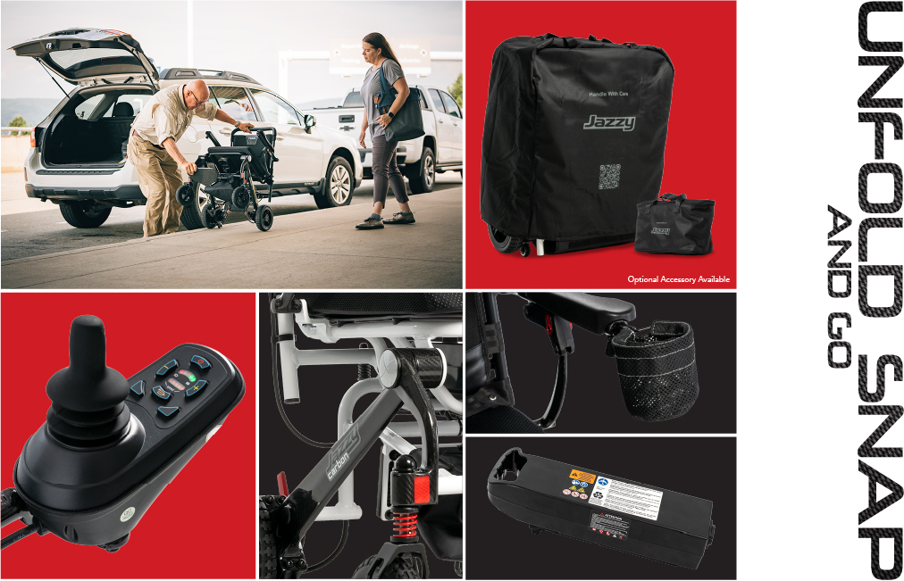 Jazzy Carbon gives you mobility and control to do it all. And now with our new Jazzy Travel Bag Kit, (optional accessory) you can protect your unit from wear and tear throughout all your adventures, while enjoying another convenient option to transport your powerchair by towing it behind you like luggage.
