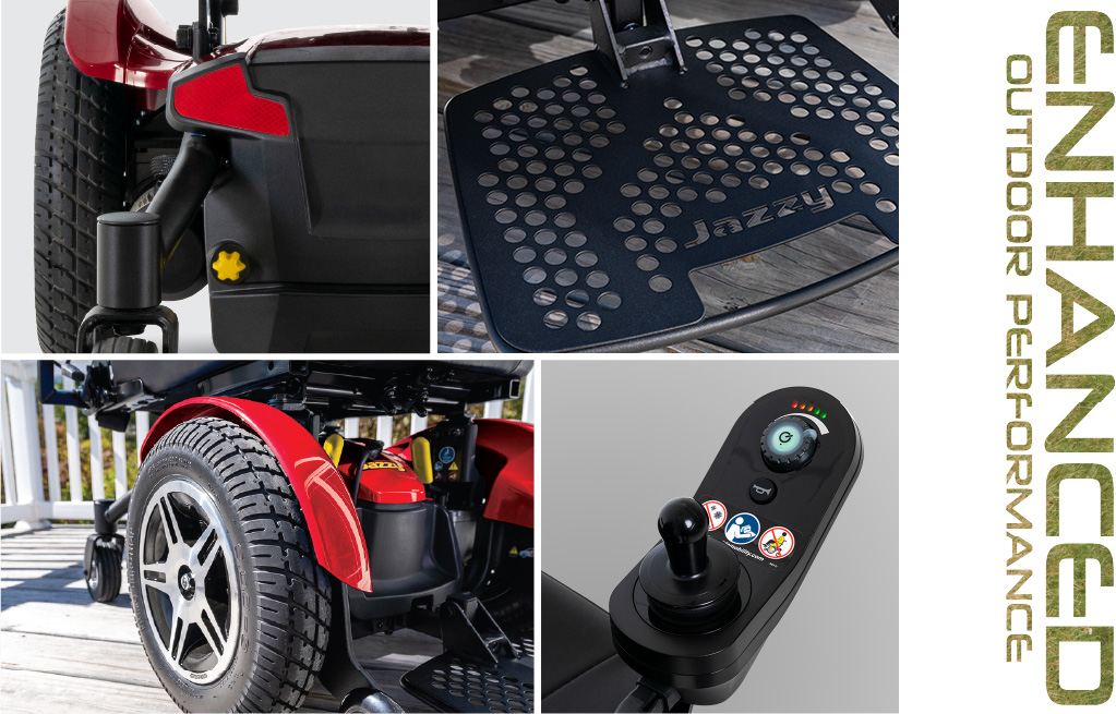 When business or pleasure takes you outside, the Jazzy Elite 14 is ready to impress. Bulked up 14-inch tires chew up uneven terrain and tame major bumps. The tire configuration, which includes front anti-tip wheels and rear casters, is made to climb. Take on hills, ramps or whatever obstacles you come across. Simply cruise over grade changes and new surfaces. The performance is nothing short of elite.